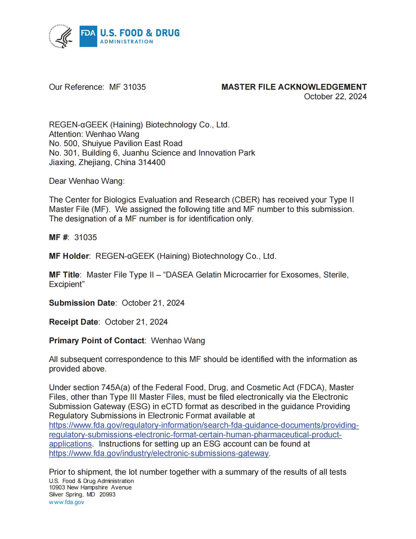 Recently, the DASEA® Regencarrier® biomimetic microcarrier, independently developed by REGEN-αGEEK, have successively obtained Drug Master File (DMF) filings with both the Center for Biologics Evaluation and Research (CBER) and the Center for Drug Evaluation and Research (CDER) under the US Food and Drug Administration (FDA). This achievement marks them as China's first* biomimetic microcarrier specifically optimized for 3D exosome cultivation (*Source: CDER publicly listed DMF registry, data as of Q3 2024).