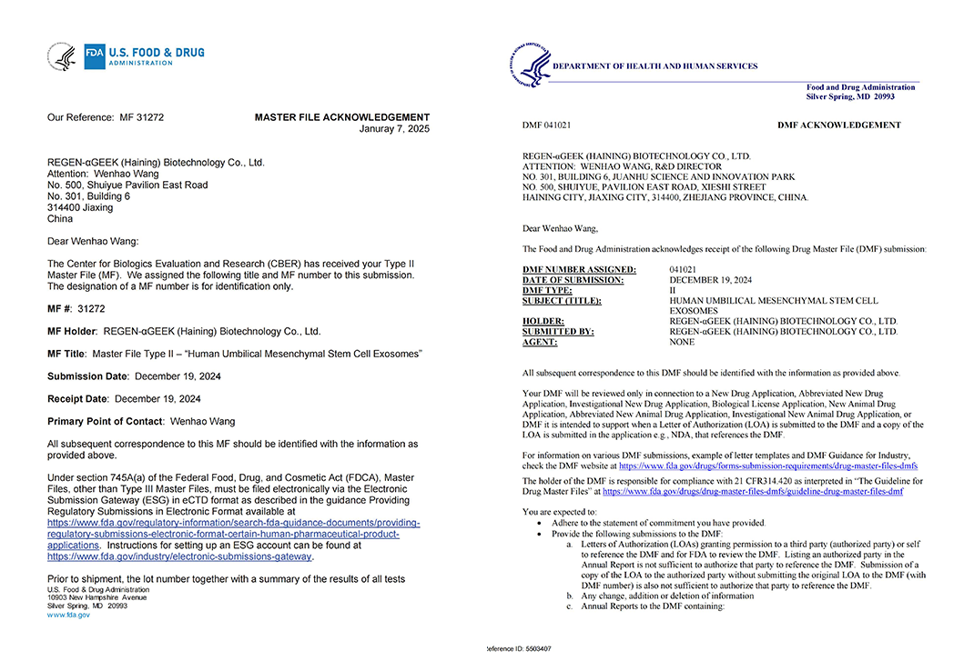 On January 7, 2025, REGEN-αGEEK kicked off the new year with major news: its human umbilical cord mesenchymal stem cell-derived exosomes, prepared using the self-developed DASEA® bio-manufacturing platform with 3D cultivation, have successfully obtained dual Drug Master File (DMF) filings with both the Center for Biologics Evaluation and Research (CBER) and the Center for Drug Evaluation and Research (CDER) under the US Food and Drug Administration (FDA).